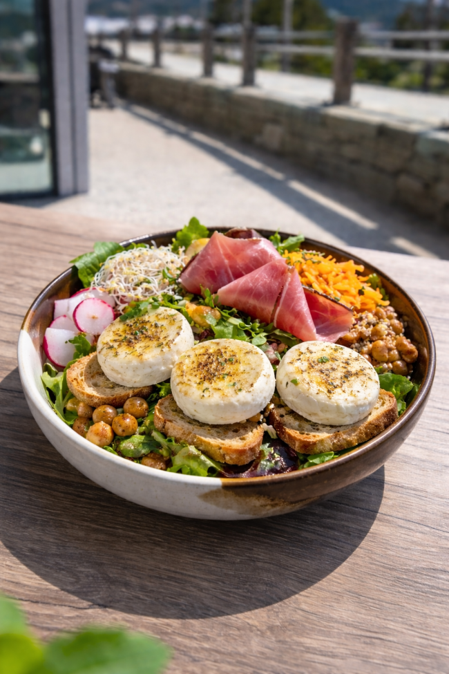 Ingrédients : Jeunes pousses de mesclun, carottes fraîches râpées, palets de fromage de chèvre frais (Chèvrerie de la Pierre à Laya), jambon sec de montagne, pain sans gluten (farines de riz/sarrasin), pois chiches rôtis, radis, betterave rouge, graines germées, vinaigrette maison (huile d'olive, curcuma, citron, poivre noir).