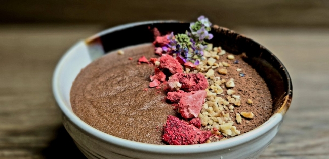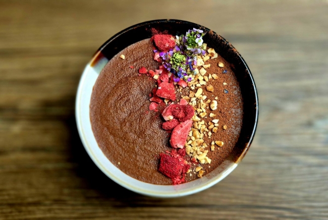 Ingrédients : Chocolat noir 70%, Aquafaba, topping: Granola maison (sans gluten), Fraises lyophilisées.